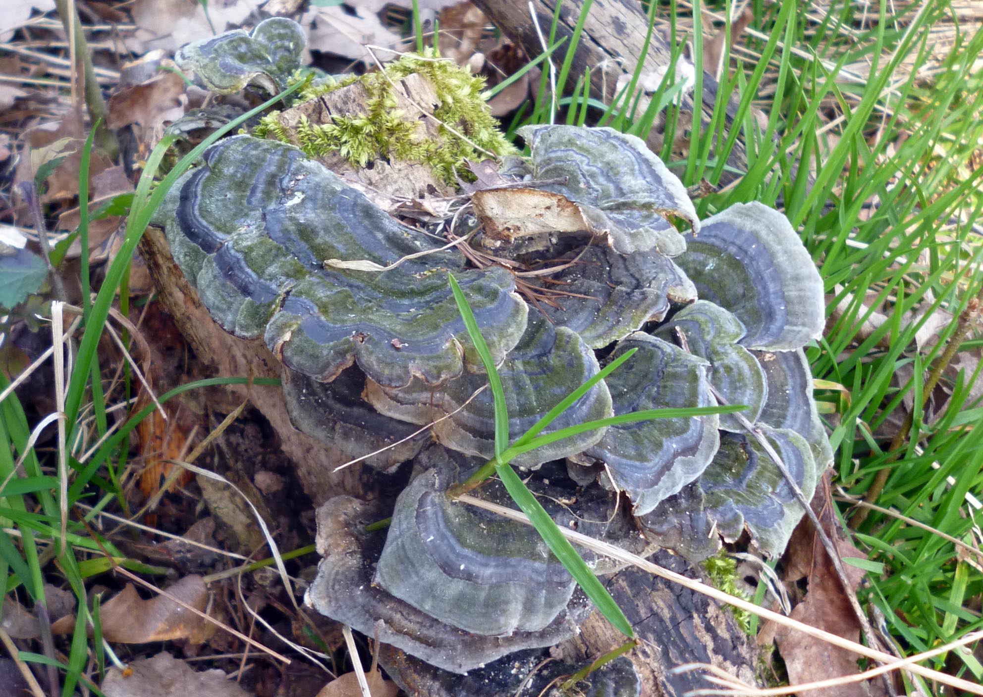 Weiße Veilchen von der Salmannsdorfer Höhe. Auch so ein ausdauernder Baumschwamm wirkt in der Frühlingssonne noch viel hübscher.